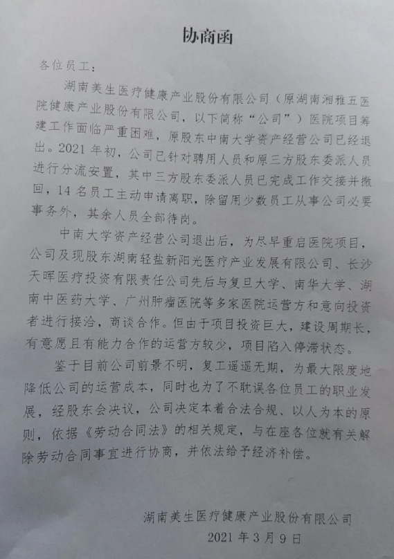 今年3月9日,一则协商函曝光,其中提到中南大学已经退出,为尽快重启医院项目,控股公司陆续和复旦大学、南华大学、湖南中医药大学、广州肿瘤医院等医院运营方和意向投资者进行过接洽,商谈合作,但由于项目投资巨大,建设周期长,有意愿且由能力合作的运营方较少,所以项目陷入停滞状态。