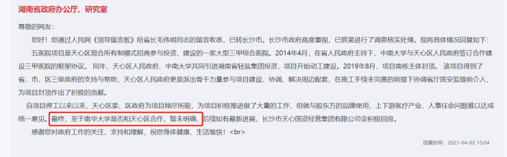 4月2日,有市民询问南华大学是否接手湘雅五医院事宜,也并未得到肯定答复。从较新的政府回复来看,湘雅五医院项目股东目前还在“积极研究解决方案,将有序、稳妥推进上述问题的解决”,也就是说要找到有意愿且由能力合作的运营方。