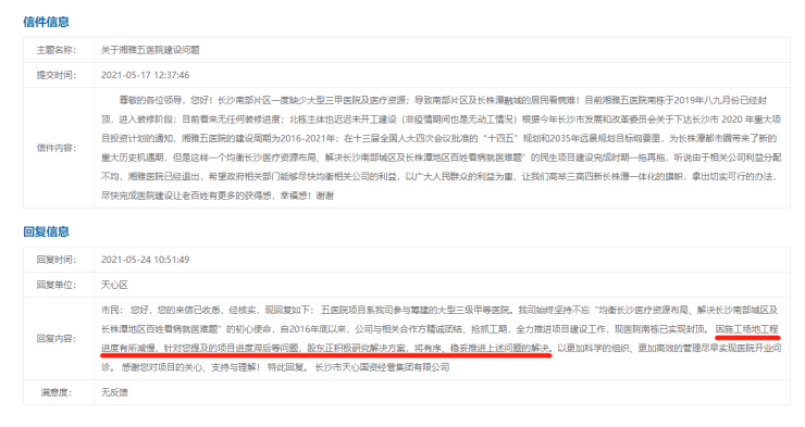 日前,有市民咨询湘雅五医院建设问题,天心国资经营集团有限公司5月24日回复称:针对项目进度滞后等问题,股东正积极研究解决方案,将有序、稳妥推进上述问题的解决。具体开工时间和开业时间在信件中并未回复。