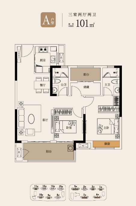 建面约101㎡可做三房,和市面上110㎡左右的户型相比毫不逊色。做到了动静分区,南向阳台直连卧室。而且房间内该有的功能也没有做减配,每个空间都很宽阔,不会显得局促。