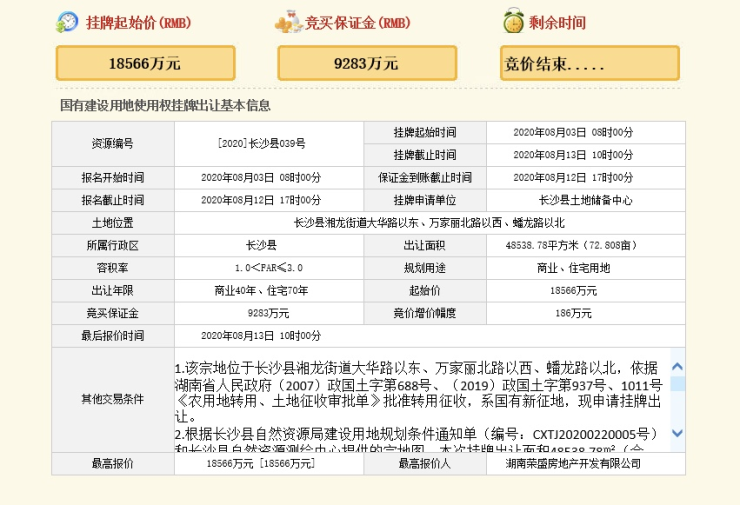 8月13日,湖南荣盛房地产开发有限公司以18566万元的底价摘得[2020]长沙县039号地块。该地块出让面积为48538.78平方米,约合72.808亩,挂牌起始价为18566万元,成交楼面价为1275元/平方米。