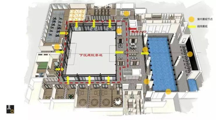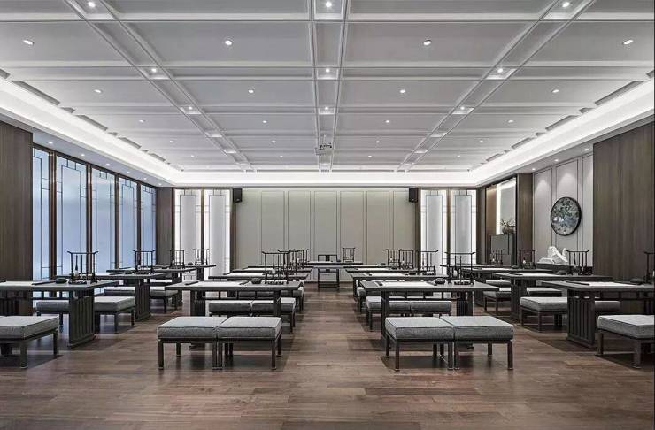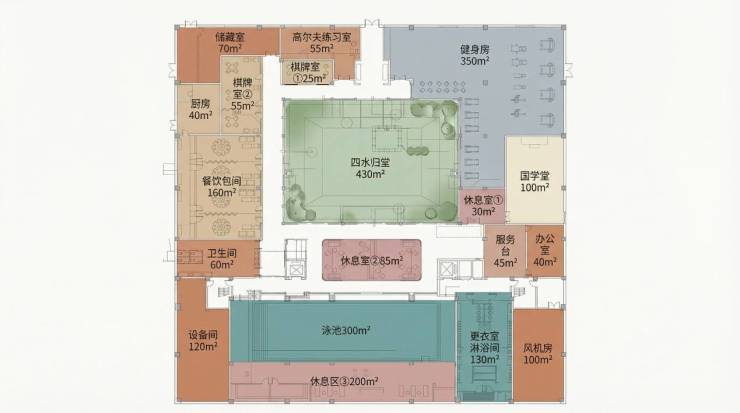 营销中心后院的下沉式会所被命名为"四水归堂",寓意聚拢财气。内部设置了健身房、恒温泳池、国学堂等功能空间。