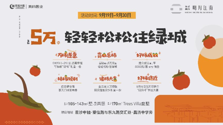 “仰头看明月,寄情千里光。”中秋小长假之际,绿城美的·明月江南特别推出“好事来袭,6重好礼惠星城”钜惠活动。凡到访绿城美的明月江南生活美学馆,可领取“好柿”礼盒一份。9月19-30日期间置业,还可享受较低首付5万元起的钜惠。