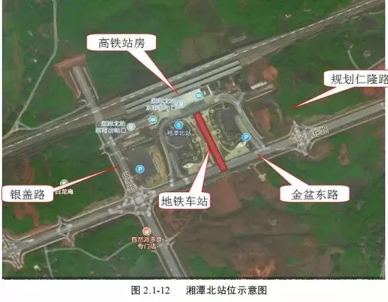 湘潭北站位于银盖路与金鹏东路交口北侧地块内,高铁站湘潭北站站前广场 中部的下沉广场地下。周边除了高铁站及配套商业基本上为空地或者在建区。本站目前主要客流来源为高铁换乘客流。