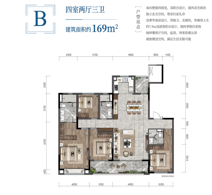 建面约169㎡洋房拥有约7.9米双面宽阳台,能将更多外部风景揽入家中。实际得房率高,实用面积空间感强。双套房设计、客餐厅宽绰、南北双阳台……居家舒适感效果拉满。