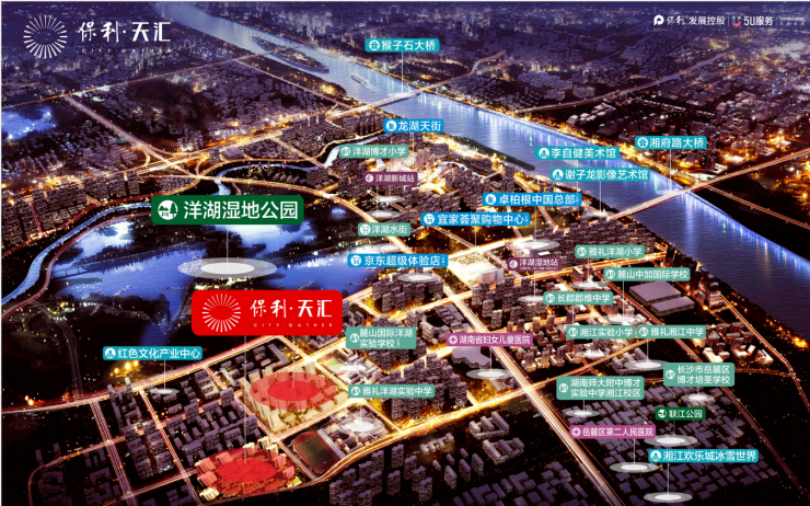 总建面约58万方的保利·天汇,位于景园路与周家湾路交汇处的西南角,是湘江新区洋湖国际生态新城的特别核心地段。约7200亩的国家4A级景区洋湖湿地公园是家门口的“天然氧吧”,片区内负氧离子含量高出老城区6倍之多。项目周边环绕着雅礼洋湖实验中学、长郡双语、麓山国际洋湖实验学校(在建)等多所知名学校。李自健美术馆、谢子龙影像馆等艺术场馆举步即达,能惬意领略湖湘文化的魅力。与此同时,项目直线距离1千米的范围内,还汇聚着宜家荟聚中心等商业综合体、三甲医院湖南妇女儿童医院、地铁三号线洋湖湿地站,真正满足业主对美好生活的多元化需求。