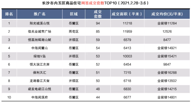 从项目表现来看,岳麓区的阳光城溪山悦、中海阅麓山、保利天汇、恒大滨江左岸,开福区的旭辉恒基湖山赋、龙湖春江天玺、绿地V岛,雨花区的佳兆业城市广场等项目成交表现亮眼,在诸多项目中名列前茅。