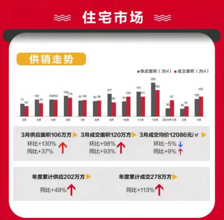 湖南中原研究院的数据显示,3月长沙内五区新建商品住宅总计供应106万方,环比上升130%,同比增加37%;成交面积120万方,环比上涨98%,同比上涨93%。成交均价为12086元/㎡,环比下跌5%,同比上涨9%。各项数据均处于“当打之月”,供求双双上扬。