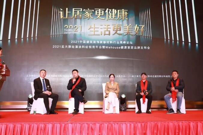 随后的建筑装饰装修行业高峰论坛环节由中国建筑装饰装修材料协会投资促进部部长、硅藻泥分会秘书长朱厚举、蓝天豚绿色建筑新材料有限公司总经理易丹、蓝天豚绿色建筑新材料有限公司常务副总向湛、广西防城港代理经销商刘国涛、广州花都区代理经销商黄立祥共同参与,五位行业专家领导就硅藻行业未来的变化、蓝天豚在未来的战略举措和战略规划、市场经营的成功的心得和方法、蓝天豚战略调整对经销商的影响以及一线城市经营理念五大问题进行探讨。
