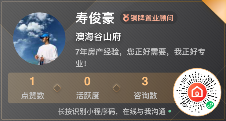 【楼盘动态】澳海谷山府22号栋建面127平洋房产品认筹时间为9月30日-10月1日,均价7700元/平,共34套房源,10月1日开盘。可扫描下方小程序码一键拨打售楼部电话联系置业顾问。