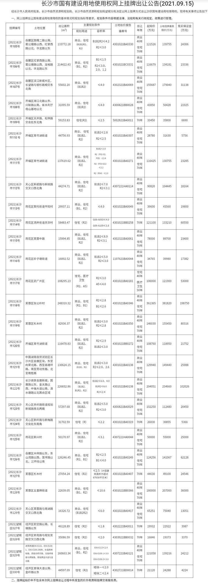 千呼万唤始出来,长沙第二次集中土拍出让公告正式出炉!9月15日,长沙市国土资源交易网站发布了编号为ZRZY-CSS-2021580、ZRZY-WCQ-2021111的《长沙市国有建设用地使用权网上挂牌出让公告》和《望城区国有建设用地使用权网上挂牌出让公告》。此次集中供应公开挂牌出让29宗住宅用地,将于10月15日正式开拍。