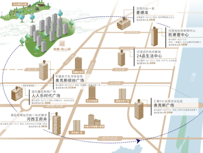 以市府为中芯发散,周边不仅有桐梓坡商圈的老牌商业,更有奥克斯广场、凯德壹中心、渔人码头、奥克斯缤纷广场、麦德龙等。