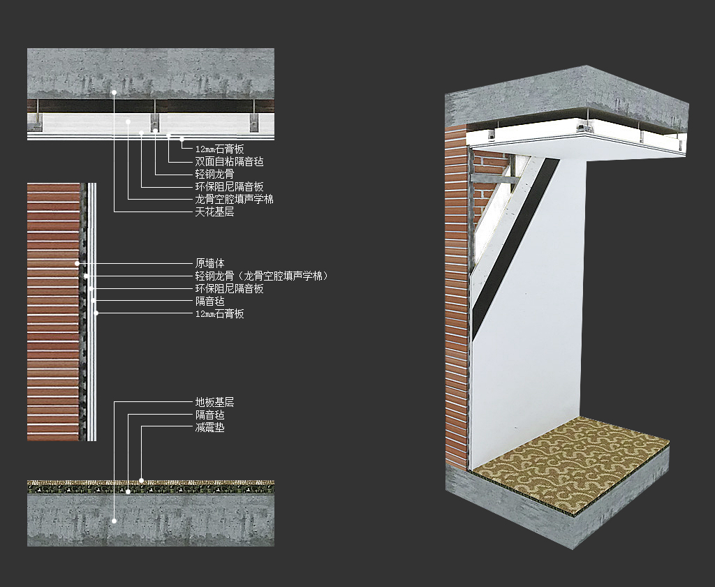 属性:隔音量50分贝左右;吊顶厚度19厘米,墙面厚度8厘米,地面不增加厚度。
