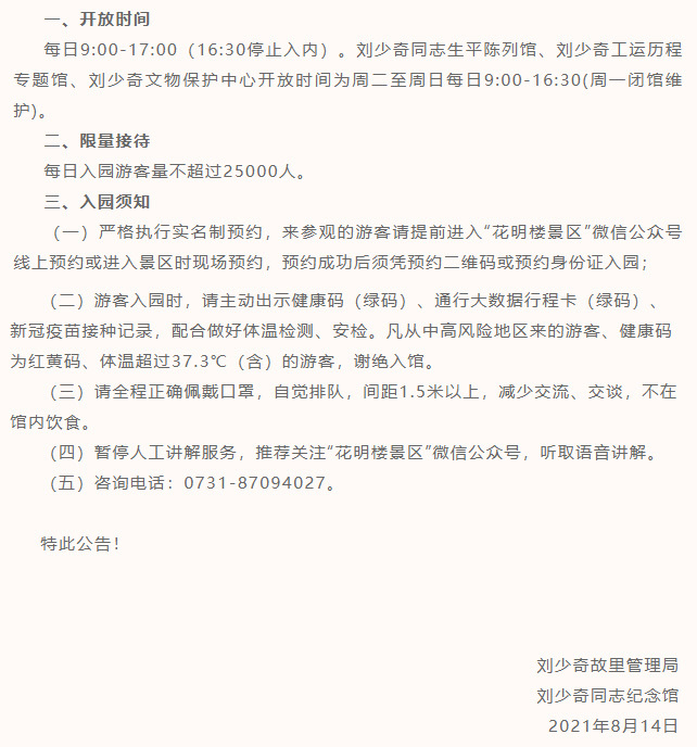 刘少奇故里花明楼景区将于2021年8月16日起恢复对外开放。