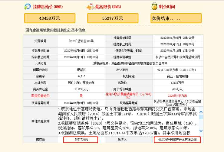 4月15日,经过29轮竞价,[2020]望城区005号地块达到土地较高限价55277万元,而遭熔断,溢价27.19%,楼面价2000元/平。该地块原定将于2020年4月28日摇号定主。