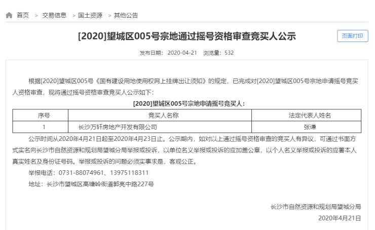 但意外的是,2020年4月21日,长沙公共资源交易电子服务平台发布一则公示。公示内容显示,长沙万轩房地产开发有限公司通过[2020]望城区005号宗地摇号资格审查,公示时间从2020年4月21日起至2020年4月23日止。此前,地块共有5家房企参与竞价,最终仅长沙万轩房地产开发有限公司这一家房企通过摇号资格审查。