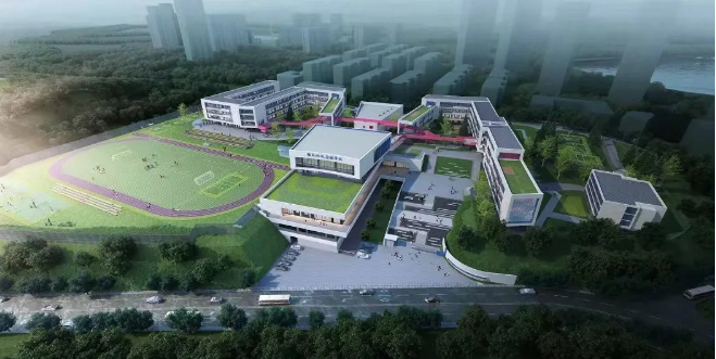 雅礼田汉实验学校 位于长沙县果园镇田汉艺术小镇宋水线与杜鹃路交汇处,规划办学规模为54个班。