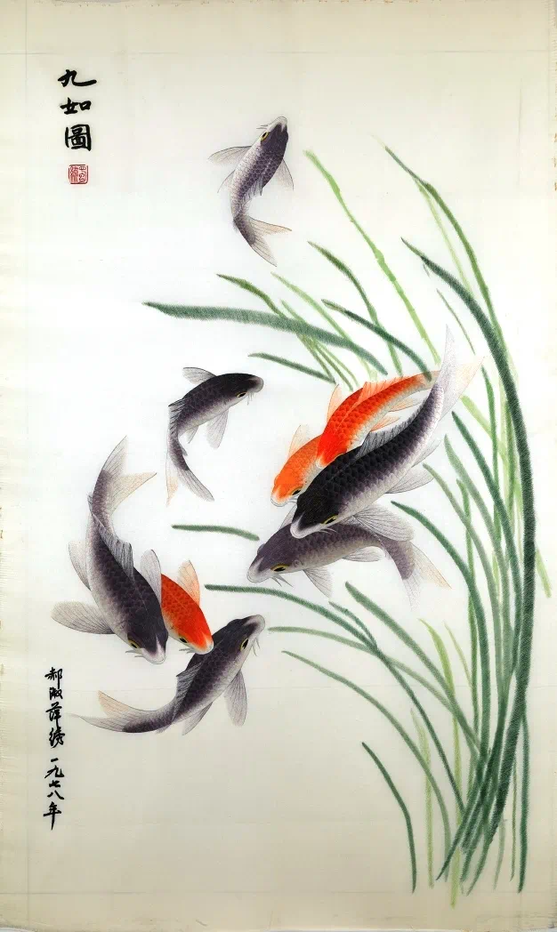 世间之趣,妙手偶得。《九如图》是当代传承蜀绣的杰出作品,郝淑萍大师凭借此作获得了亚太地区工艺美术师大奖。绣品在技法传承上堪称典范,作品采用盖针、点针、沙针、复盖针等蜀绣的传统技法施针、设色,使鲤鱼在水中的远近、深浅层次分明、虚实得当,游弋灵活怡然、栩栩如生,呈现出“不绣水波但见水动的妙处”。