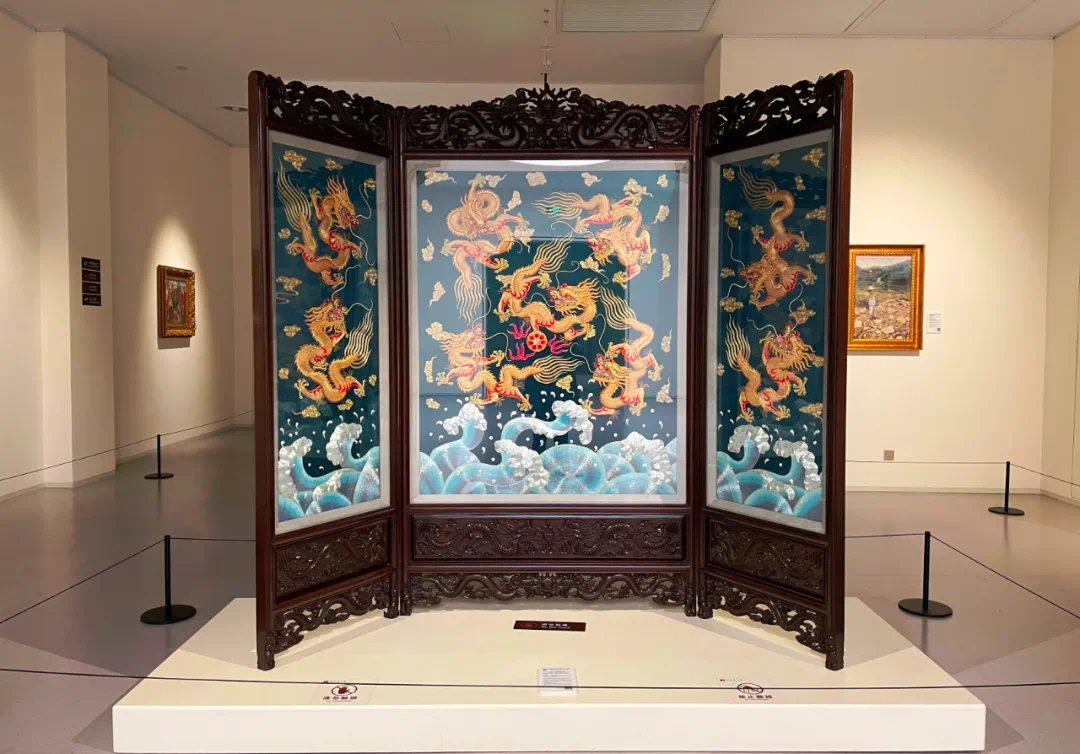 粤绣是广东地区代表性刺绣,是广州刺绣(广绣)和潮州刺绣(潮绣)的总称,刺绣所用材料广泛,富有传统特色和鲜明的时代气息,绣品技艺精湛,匠心独运,享誉中外。林玩英、李木兰和王锦兰三位潮绣老艺人绣制的《九龙图围屏》,是潮绣中的代表作品,曾荣获排名前列届中国工艺美术百花奖金奖。作品采用真金真银线绣制,使用垫高绣针法,在绣的纹路上铺贴一些棉絮、纸片垫高成形九条昂扬向上的飞龙和汹涌澎湃的海浪,绣品具有浮雕般的立体感,工艺难度大,代表当代潮绣艺术创新的较高水平。