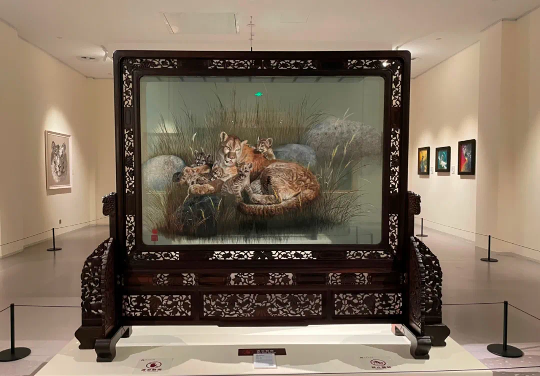 绣珍阁里还珍藏有湘绣大师周金秀、刘爱云、邬建美的《清泉饮虎图》《雄狮幼狮图》《猎犬双栖图》《青铜四羊方尊》,苏绣大师顾文霞、邹英姿的《四骏图》《青铜后母戊鼎》,蜀绣大师郝淑萍的《珐琅七彩瓶》,粤绣大师陈少芳的《凤冠鸟》,发绣大师周莹华的《货郎图》,鲁绣大师宋爱华、崔丽娟的《松鼠图》,以及苗绣精品等等,300多件珍品,展现出300多个优美的画面,讲述了300多个生动的故事,可谓妙由心生,巧手使成。