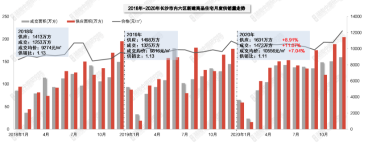 湖南中原研究院的统计数据显示,2020年长沙内六区新建商品住宅供应面积1631万平方米,较前一年增加8.91%;成交面积1472万平方米,较前一年上升11.07%;成交均价10556元/㎡,上扬7.04%。