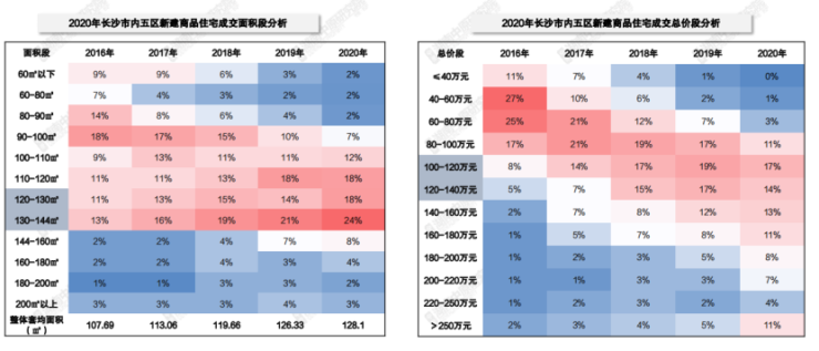 在“房票”紧张的情况下,改善型需求在2020年进一步得到释放。内五区新建商品住宅主力面积段成交集中在130㎡-144㎡区间,主力价格段成交集中在100-140万区间。