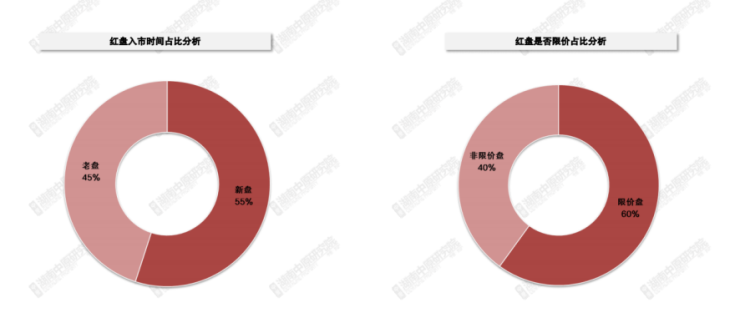 2020年红盘以新入市的限价盘为主,分别占比55%、60%,一方面凭借有限价限制,具有一定性价比优势,另一方面新盘在产品打造、实景展示方面相对突出。