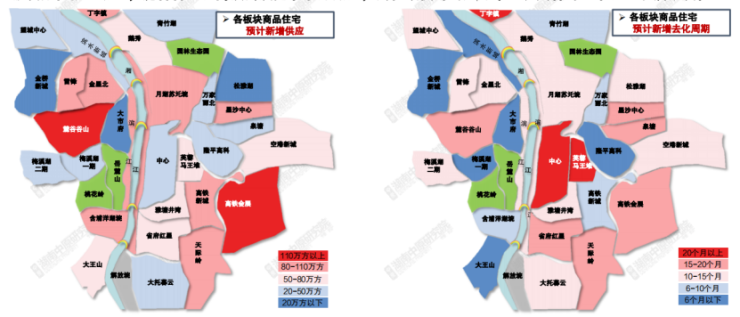 在供销均衡的大背景下,绝大多数板块去化压力较小,去化周期在6个月以下。值得注意的是,大托暮云板块去化周期在14个月以上,中心板块去化周期在12个以上,存在一定的去化压力与风险。