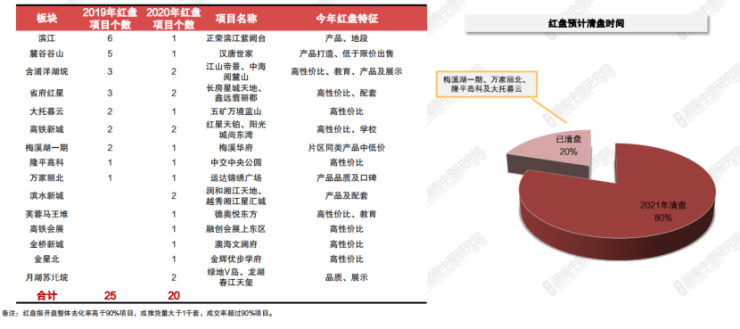 2020年,红盘的板块集中度变低,单板块热销红盘最多仅有2个,红盘分布范围由之前的9大板块扩大为15大板块。热销原因不再为单一的低价,客户逐渐关注产品打造、品质及各项配套综合考量。 20个红盘项目中仅4个项目住宅已推完,16个项目总计168万方明年可清盘,红盘项目持续迭代。