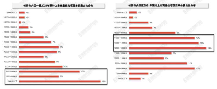 湖南中原研究院预计2021年内五区商品住宅的单价将有所上移,推货主力集中在12000-15000元/㎡区间,占比39%。六区一县商品住宅项目预计总货值2132亿元,单盘货值集中在10亿元以下,多为明年清盘项目或小体量新盘,大盘更加稀缺,预计2021年各盘之间竞争加剧。