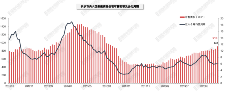 近年来,长沙楼市去化速度一直步履不停。自2016年3月以来,内六区已拿预售证未成交的住宅量一直低于1千万方,周期控制在10个月以下。截至2020年底,内六区新建商品住宅库存量为913万方,去化周期为6个月,整体市场去化环境健康。