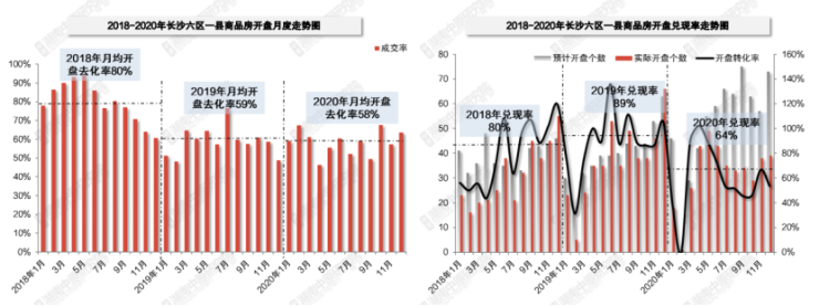 2020年月均开盘去化率为58%,处在荣枯线徘徊,基本与去年一致。在整体供应量拉高的前提下,2020年越来越多的项目选择平推入市。与往年相比,开盘去化率达到90%以上的红盘数量明显减少。