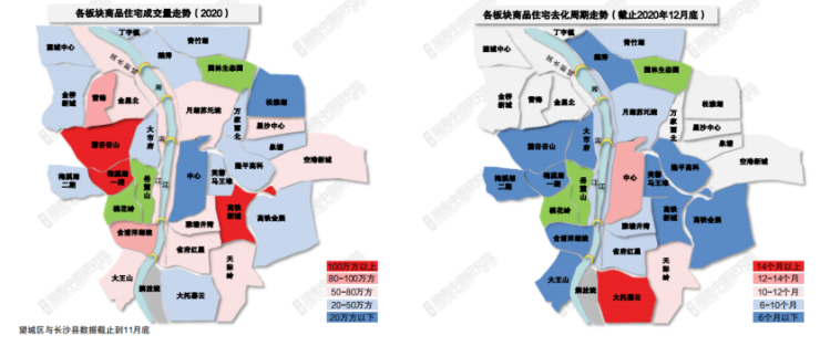 从各板块片区来看,高铁新城、麓谷谷山等板块在2020年去化表现亮眼,成交均破百万方。含浦洋湖垸、雷锋等板块去化成交量也达到80万方以上。