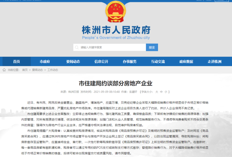 今日,株洲市住建局约谈部分房地产企业,起因是,部分房企及代理销售公司大幅降低销售价格,并明显低于市场正常价格销售或代理销售新建商品房,严重扰乱房地产市场秩序。