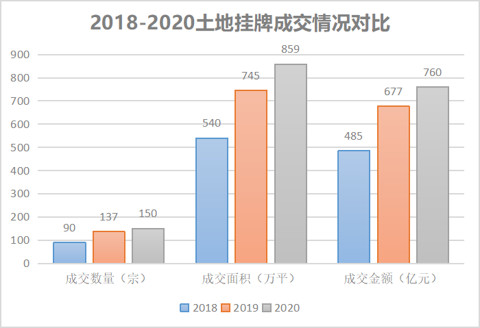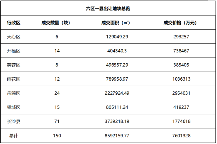 据搜狐焦点统计,2020年全年,长沙六区一县(天心区、开福区、芙蓉区、雨花区、岳麓区、望城区、长沙县)共有150宗商住类土地用地成交,成交总面积约859万㎡,总成交价格约为760.1亿元。成交数量、成交面积以及成交价格与近两年相比均有上涨趋势。