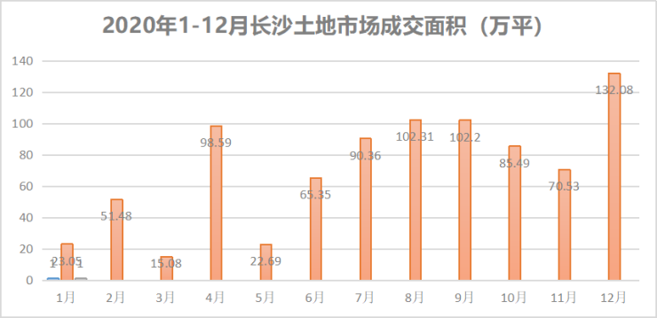 2020年前3个月,受疫情影响,长沙土地市场成交低迷,4月土地成交猛增,量价齐飞,达到上半年峰值。下半年供应力度不减,月均成交面积在90万方以上,在12月达到成交峰值。
